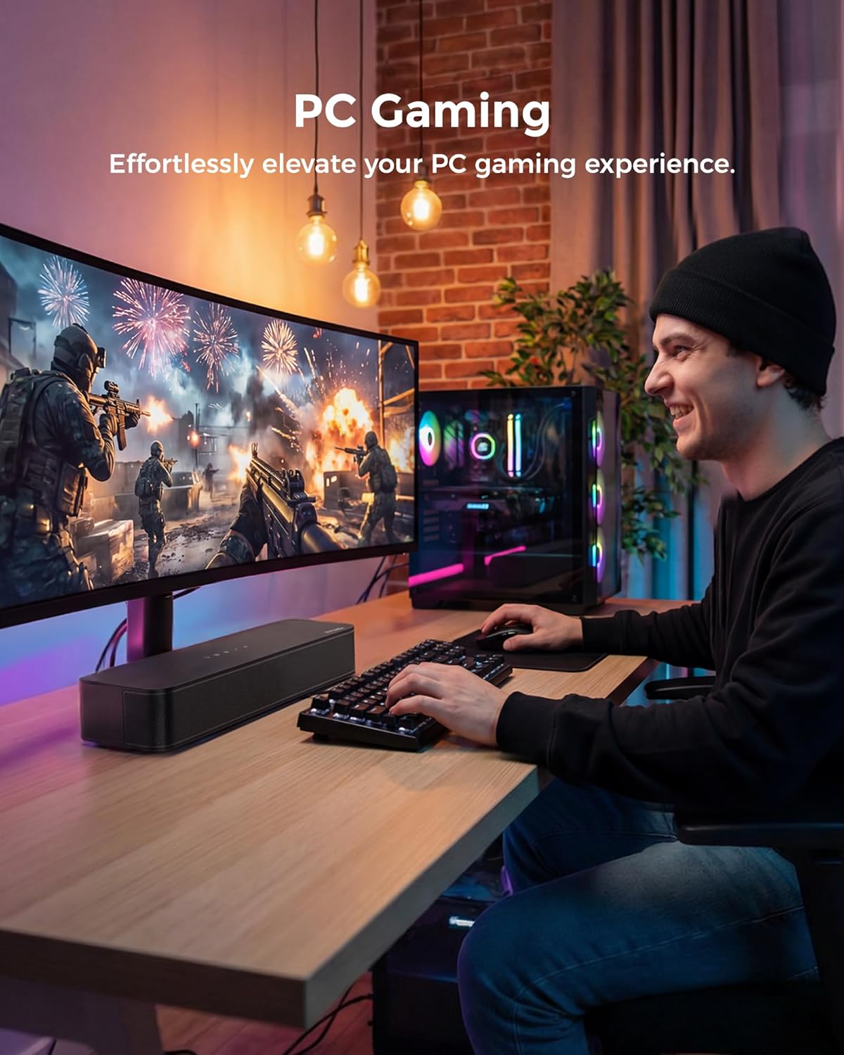 - Alt-i-ett-design: Built-in dual speakers, a 3-inch subwoofer, and side-firing bass ports deliver deeper lows and expand surround effects. The 2.1ch sound offers a superior audio experience for movies, music, or games.
